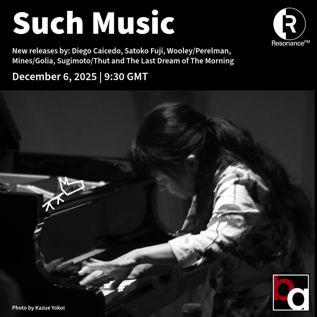 The online radio show Such Music, hosted by journalist and artistic director of Latvia’s Skaņu Mežs festival Rihards Endriksons, is devoted to new works of free improvised music, either previously unheard or created specifically for the show. The show is produced in collaboration with Burning Ambulance, and the final episode of 2025 rounds up some recent releases including the latest BA CDs from Spanish guitarist Diego Caicedo and the duo of Ivo Perelman & Nate Wooley; Satoko Fujii’s new album with an avant-jazz rock quartet on her own Libra label; Taku Sugimoto & Stefan Thut’s riverside-recorded duo on Ftarri; Kelsey Mines & Vinny Golia’s human voice-colored new album on Relative Pitch; and another excellent album by The Last Dream of The Morning (the trio of John Butcher, John Edwards, and Mark Sanders) on Fundacja Sluchaj. Listen on Mixcloud.